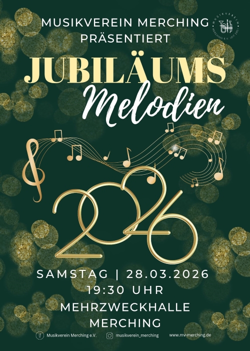 Motto JUBILÄUMS-Melodien begrüßen zu dürfen. Das Konzert findet um 19:30 Uhr in der Mehrzweckhalle Merching statt. Der Eintritt ist auch dieses Jahr frei.