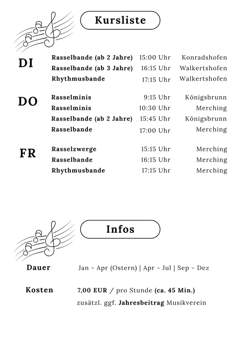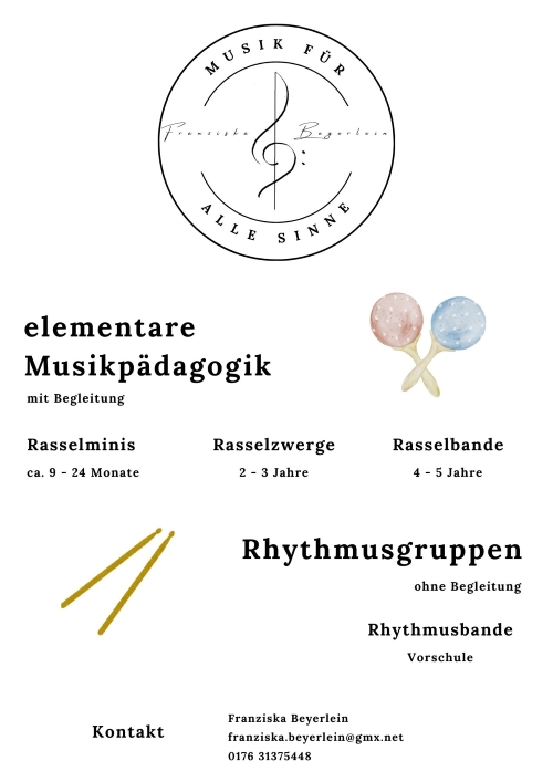 In Kooperation mit dem Musikverein bietet unsere Dirigentin Franziska Beyerlein in unserem Probenheim die elementare Musikpädagogik für Kinder an. Bei Fragen oder Interesse an einer Teilnahme kontaktieren